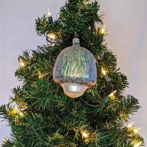 Round head ornament with green-ish tinted skin, purple and green glittery hair, and a mouth with fangs.