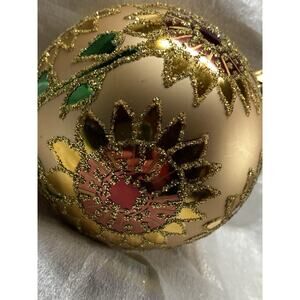 Beautiful and rare Christopher Radko Vincent’s Prize ornament, first released in 1996 and now retired. This hand-blown, hand-painted glass ball ornament features a vibrant sunflower motif with gold glitter petals, deep red centers, and green leaves against a satin gold background. Finished with an authentic Radko gold cap stamped RADKO.