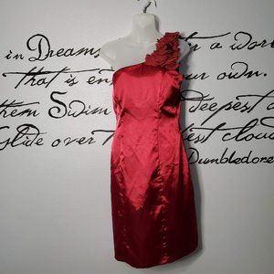 Gorgeous ruby red Holiday cocktail dress by Christopher Straub for Maurices. Features soft satin material, single shoulder, sheer flower petal ruffles on strap, flattering seams, back zipper with hook & eye closure, elasticized back band, & fully lined.