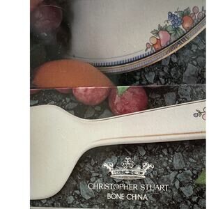 This exquisite bone-china cake plate comes in its original packaging from Christopher Stuart, adding to its collectible appeal. With a generous 12" diameter, it's perfect for showcasing your favorite cakes and desserts. The "Fruit Basket" design adds a touch of elegance to any table setting.