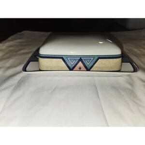 The Christopher Stuart Y0232 Butter Dish with Lid is a rectangular butter keeper made of porcelain, featuring a western pattern in multicolor with a glossy finish. Made in Thailand this dish is perfect for keeping butter fresh and easily accessible during meals. The sleek design and quality material make it a stylish and practical addition to any kitchen or dining table. The dish does have a small paint chip on the corner, which i show in the pictures above.