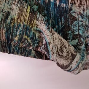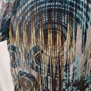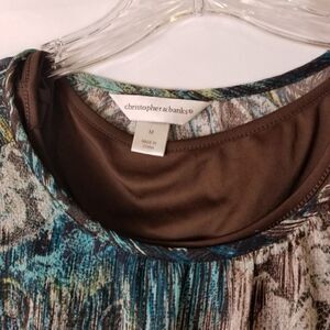 This is a brown tank with a semi sheer outer top. Turquoise and brown. Size M. Has elastic at waist. Approximate measurements are pit to pit 21". Length is approximately 23". Sleeves are approximately 17". 3/4 sleeves. Sleeves also have elastic on them. Very good condition.