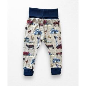Adorable, comfy barnyard themed pants from small shop Christopher and Tobias. Knit cuffs and knit foldover waistband with a decorative rope bow. GUC for a faint smudge on knee as shown in last pic. It blends in and I initially thought it was part of the pattern.