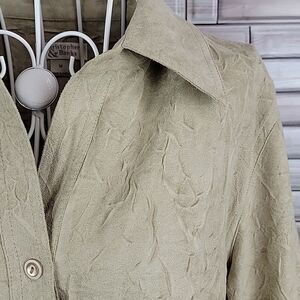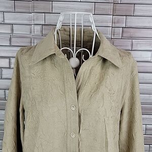 100% polyester crinkled texture soft button-down shirt by Christopher and Banks collared with cuffed button sleeves and a scalloped hemline. Great pre-owned condition.