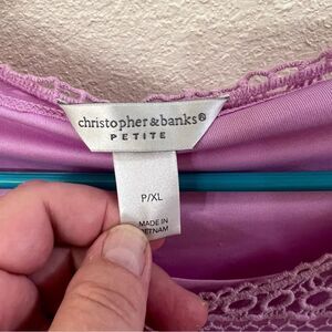 This lavender long sleeve top is from Christopher & Banks. The shell is loose knit with a lining. The shell is made out of 100% cotton. The lining is 100% polyester. The size is P/XL. The measurements are 28” L x 22” W (pit to pit) x 20” sleeve (shoulder to cuff). The top has been gently worn but is in very good condition.
