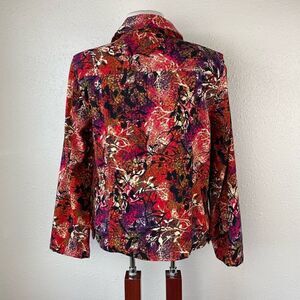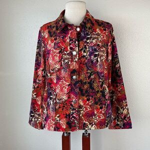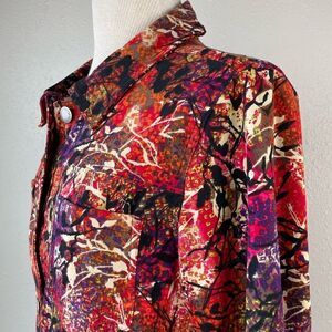 Beautiful colors and print on this heavy shirt/light jacket top by Christopher & Banks. It measures 20 inches armpit to armpit laying flat and 22 inches in length from shoulder to hem.