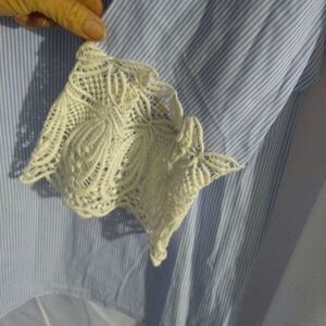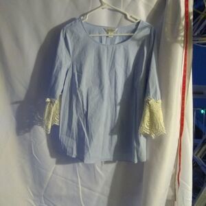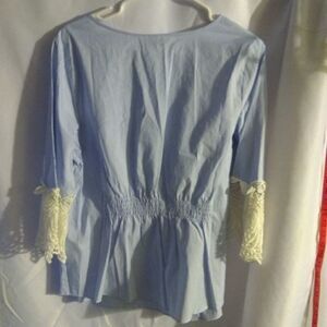 Blue and white stripe tunic top, lace on sleeves, elastic gather on back for more fitted look. Chest 21". X