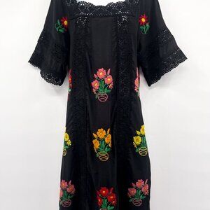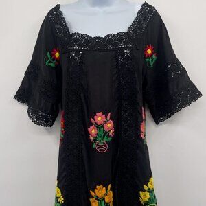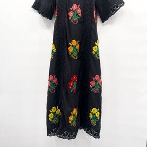 Christy Dawn Simone Dress in Noir Embroidery Hard to find style / color combo Size: Medium / Large Excellent Condition From A Smoke and Pet Free Home The Simone Dress was a year in the making. Christy Dawn teamed up with an LA embroiderer and added 28 embroidered flowers to each dress. Aside from being a wear-everywhere dress, the details are what set the Simone Dress apart with its crocheted lace and rainbow of stitched flowers. Black silhouette with shades of orange pink red yellow blue and green threading to create the embroidered floral print Medium weight black deadstock fabric, feels like cotton Pullover dress Maxi length Handmade and hand embroidered Square neckline 28 embroidered flowers and crochet details Lace trim on hems Measurements lying flat Shoulder to bottom hem 50" Underarm to Underarm 17" collectors item Blogger fave influencer casual dressy prairie peasant Cottagecore cottage core retro vintage vibes aesthetic milkmaid farm designer unicorn textured sustainable recycled sustainability lightweight airy breezy breathable dreamy ethereal whimsical fairy fairy tale garden party colorful rainbow stunning statement vibrant elegant sophisticated classic classy timeless long dainty girly Anthropologie Anthro Revolve pictures Photography Photos beach beachy crochet embellished vacation tropical coastal resort Resortwear textured dimension party special occasion holiday brunch birthday contemporary modest flowy artsy heritage culture western festival