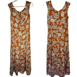 Sleeveless, v-neckline, maxi silhouette, paisley print, orange, boho, long, floral, cottagecore, boho, fall, autumn, red, fairy, garden, midi, terracotta, rust, rose, ustainable, deadstock, floral, high low, cottage, garden, tea party, dressy, wedding guest, special event, maxi, garden party, boho, fairy