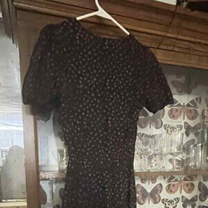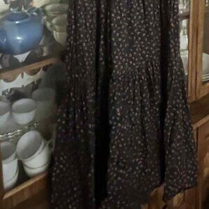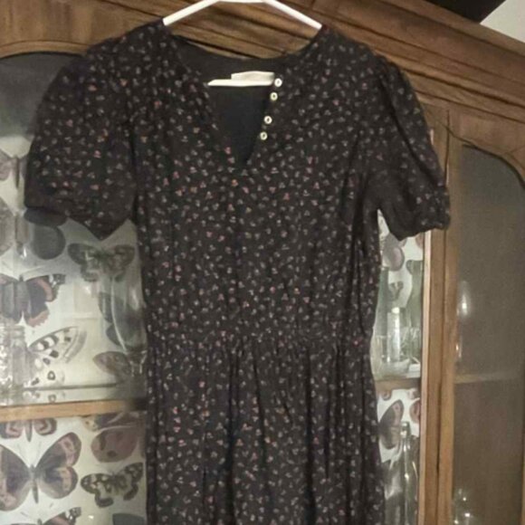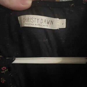 This is a midi-length dress with a V-neckline and short sleeves. It is known for its tiered skirt and is often made from organic cotton with a "Pollinator Garden" print. The dress is part of the Christy Dawn collection, a brand that focuses on sustainable and ethically made clothing. Excellent condition.