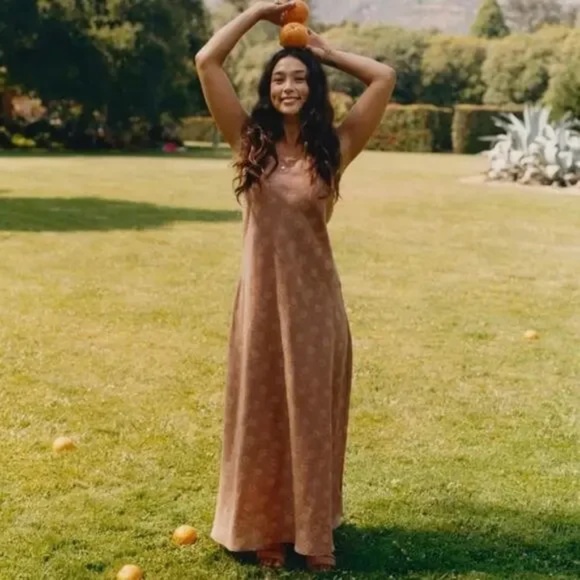 Christy Dawn Sage maxi dress in size L. Fabric is a very soft, rust colored cotton in a cute block print. The dress is sleeveless, unstructured, and perfect for summer. This could easily be worn with layers if you want to wear it in cooler weather too.