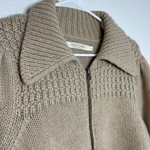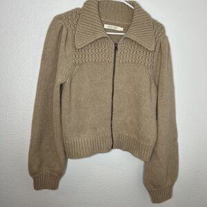Cozy knit jacket with a zip front. Features a wide collar and ribbed cuffs. Perfect for layering.