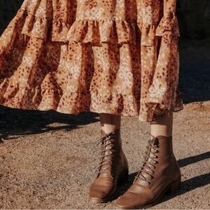 Never worn Christy Dawn The Dawn boots size 9. Hand made in Guatemala from high quality leather. Low heel and lace up rivets for feminine cottage core touch. There are a few small marks on the leather due to the nature of the material. These are meant to show character with wear. Please see photos.