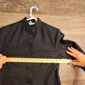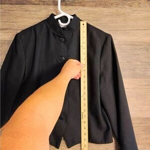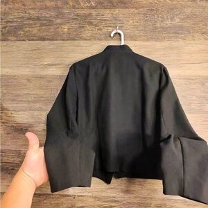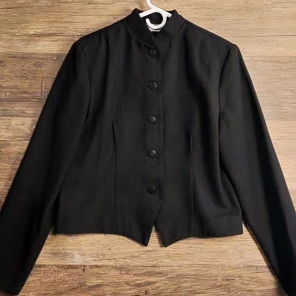Chic black blazer with button-up front. Ideal for formal and casual settings. Timeless style.