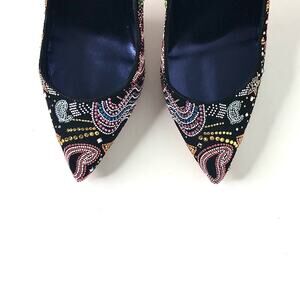 These limited edition heels have a logo and stars motif with crystals of different colors and shapes that cover the whole upper and heels.