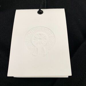 This Chrome Hearts T-shirt, crafted from high-quality cotton, features a striking graphic logo on both the front and back. The short-sleeve design provides a relaxed fit, suitable for everyday wear. Its sleek black color offers versatility in pairing with various outfits, showcasing a blend of comfort and style.