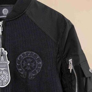 Stylish Chrome Hearts jacket. Features a sleek black design. Zipper closure and pocket details.