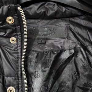 The jacket is black for a simple and elegant look, with a pink cross pattern across the body.