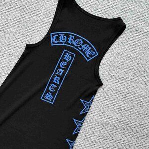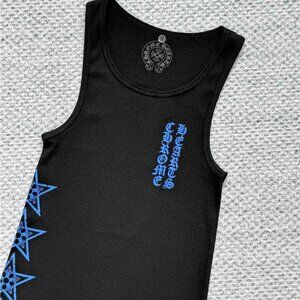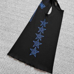 Black tank top with striking blue star accents. Features unique lettering. Ideal for casual style.