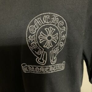 Classic black tee featuring Chrome Hearts logo. White graphic design adds a bold touch. Ideal for everyday style.