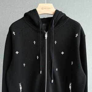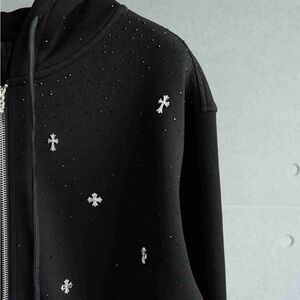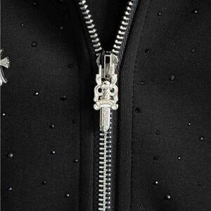 Elegant black zip-up sweater. Features silver cross accents. Classic Chrome Hearts style.