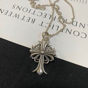 A trendy, "dark, luxurious" style! This elegant silver chain features a delicately carved cross pendant, accentuated with a distressed finish and detailed details that perfectly capture the brand's signature style.