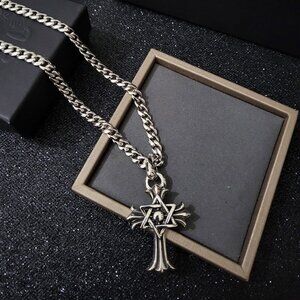 A trendy "dark hardcore king"! Made of silver, this bracelet exudes a vintage, distressed look. The cross and starburst design create a hardcore yet mysterious vibe, and the thick chain adds a touch of class.