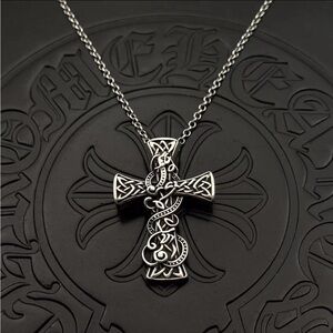 Elegant silver cross pendant necklace by Chrome Hearts. Intricate design with a bold statement.