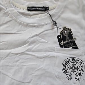 White tee with bold black Chrome Hearts emblem. Crew neck style. Iconic fashion piece.