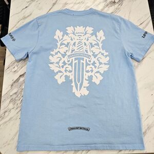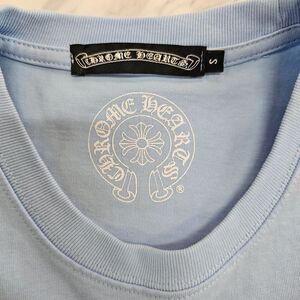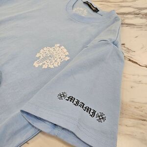Light blue short sleeve tee featuring white Chrome Hearts design. Stylish and modern.