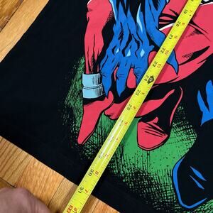 Super awesome graphic on front and back - a play on the iconic image of Bane breaking The Batman. Tagged size XL. Has some fade near collar. See pictures for details and measurements. Orders ship out on Monday, Wednesday, and Friday.