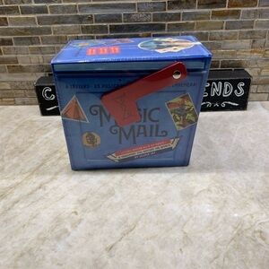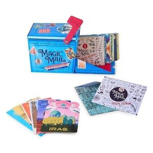 Includes box shaped like mailbox with 26 postcards, 6 letters and envelopes and a poster-sized map.