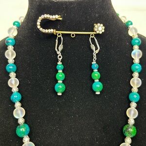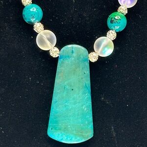 This stunning jewelry set features a necklace, bracelet, and earrings adorned with vibrant green/blue/black Chryocolla gemstone beads & enchanted crystal moonstone beads. One-Of-A-Kind jewelry set each piece is handcrafted by me making it a unique jewelry set. The pendant was purchased from @fuzzybunny_fash and that inspired me to make this set