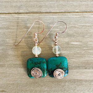 Chrysocolla and Citrine with Copper Genuine Gemstone Earrings, Handmade Original