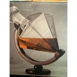 This is new inbox, diamond shape, glass, whiskey, decanter hanging on a wood base never used