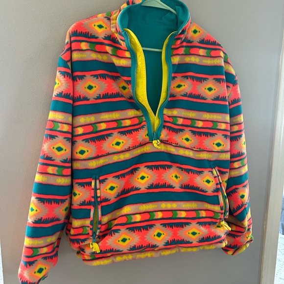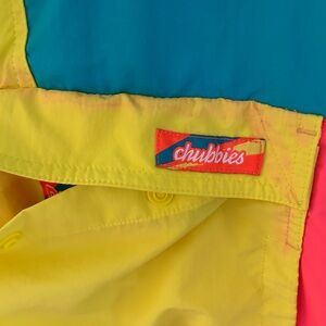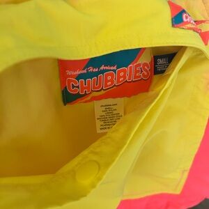 Bright jacket with teal and yellow panels. Features a bold Chubbies logo.