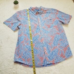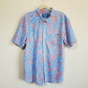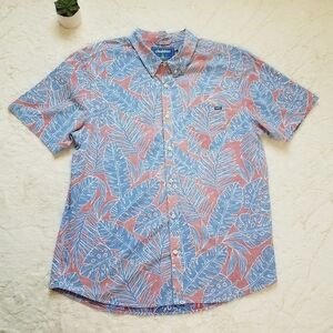 In excellent condition, leaf/Hawaiian print, short sleeve, front pocket, pleated back, 98% cotton, size XXLarge.