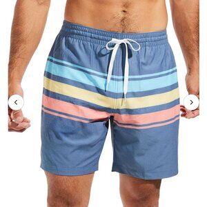 Chubbies Classic Swim Trunks The Retro Sets Size 2X Large. Waist 18"(unstretched), rise 13", inseam 7", Elastic Drawstring Waist Pockets, Zip Back Pocket, Faded Blue Heather With Stripes, Retail $70. Good Pre-Owned Condition
