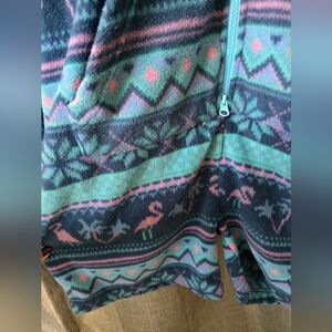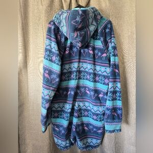 Soft fleece jacket with vibrant blue and pink design. Features a zip-up front and cozy hood.