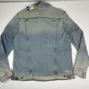 Chubbies men's XL jacket, it is The Trucker unlined style, spread collar, snap up closure, thick denim fabric, adjustable snaps on waist and cuffs, two slash front pockets and two fold over chest pockets, color is purposely stonewashed blue. Materials 99% cotton, 1% lycra. Care machine wash tumble dry low. Condition is new with flaw to missing snap on cuff as shown in pictures. Please preview measurements to ensure fit. MFSR $120.00