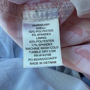 Chubbies The Fruited Planes Swim Trunk Shorts - Pull-on style flat front swim trunk shorts with a red, white & blue American Flag design & a flamingo and pineapple pattern. Elastic & drawstring tie waist. 2 side pockets & 1 back zipper pocket. Inner white mesh lining. Material has a stretch. Polyester Blend.