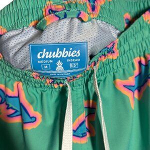 Chubbies Mens Medium Swim Trunks Shark Print Green Adjustable Drawstring 5.5" In