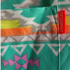 Chubbies pullover shirt in good condition with a couple tiny specks near left front hem - see photo - otherwise in great condition with no other stains, rips or tears. Made from a poly spandex fabric, this is an ideal shirt for water sports and fun in the sun. Featuring a bright Aztec pattern rendered in pastels and neon. Measures app'x: 21 inches pit to pit and 29 long.