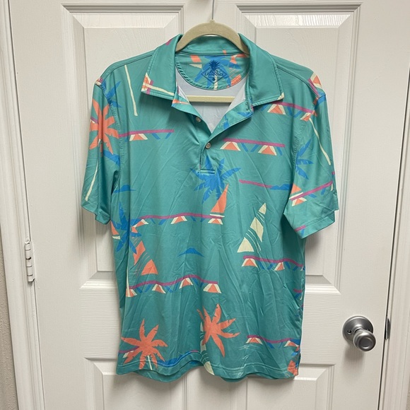 Size Small. Green short sleeve polo with palm tree and aztec like pattern. No trades. D3