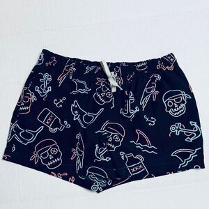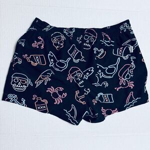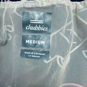 Chubbies Swim Trunks in size large - see size measurements below. "I'm the captain now" neon lights, pirate, anchor, shark and overall beach pattern. Shorts are lined have a drawstring and elastic waist. Side pockets and one back pocket.