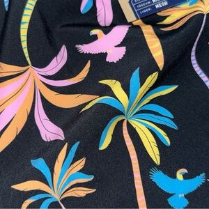 Colorful shorts with palm and bird design. Features pink, blue, and yellow on black.