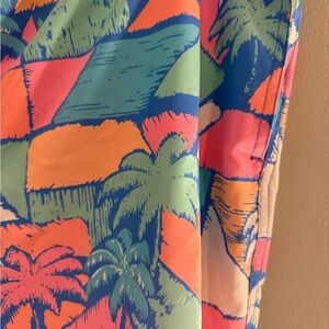 Vibrant swim trunks with tropical palm tree design. Features a drawstring waist. Perfect for beach days.