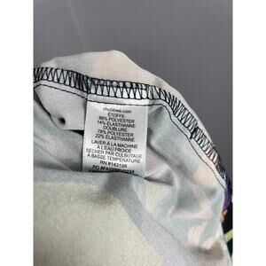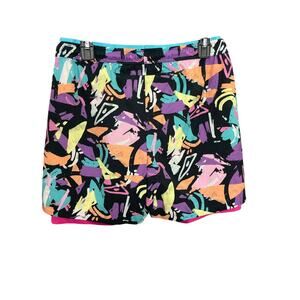 Black with an all over 90s retro colorful pattern. Lined with hot pink compression shorts.