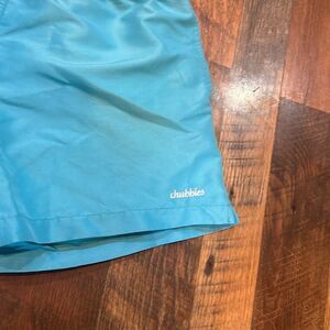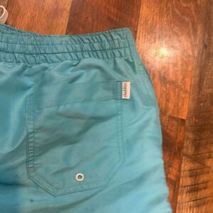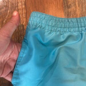Navy blue swim trunks with a mesh liner. This has side pockets as well as a back pocket and an inner drawstring around the waist.