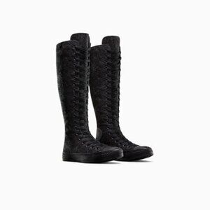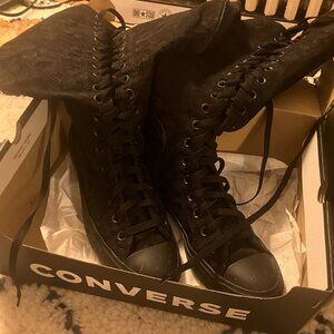 Black lace on black knee-high chuck taylors. Worn only once for an event. Women's size 8 or Men's size 6. Comes in original box.
